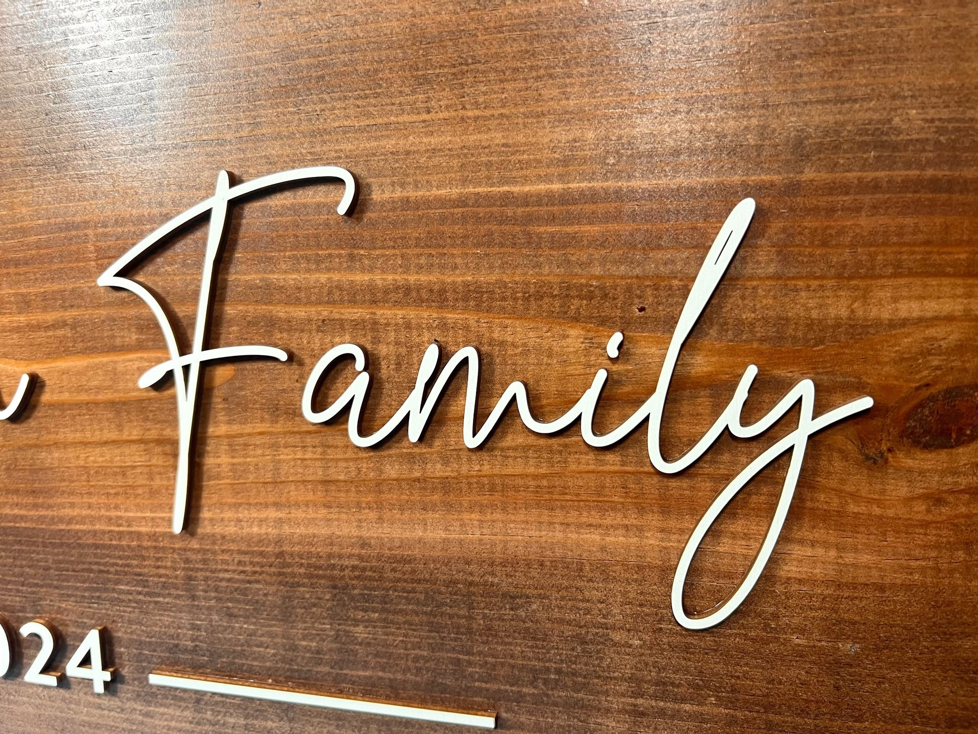 Introducing our family name sign, crafted from beautifully stained pine board with a stylish touch of 1/4 inch plywood affixed to the front. We utilize trendy signature fonts to give your sign a contemporary appeal.
