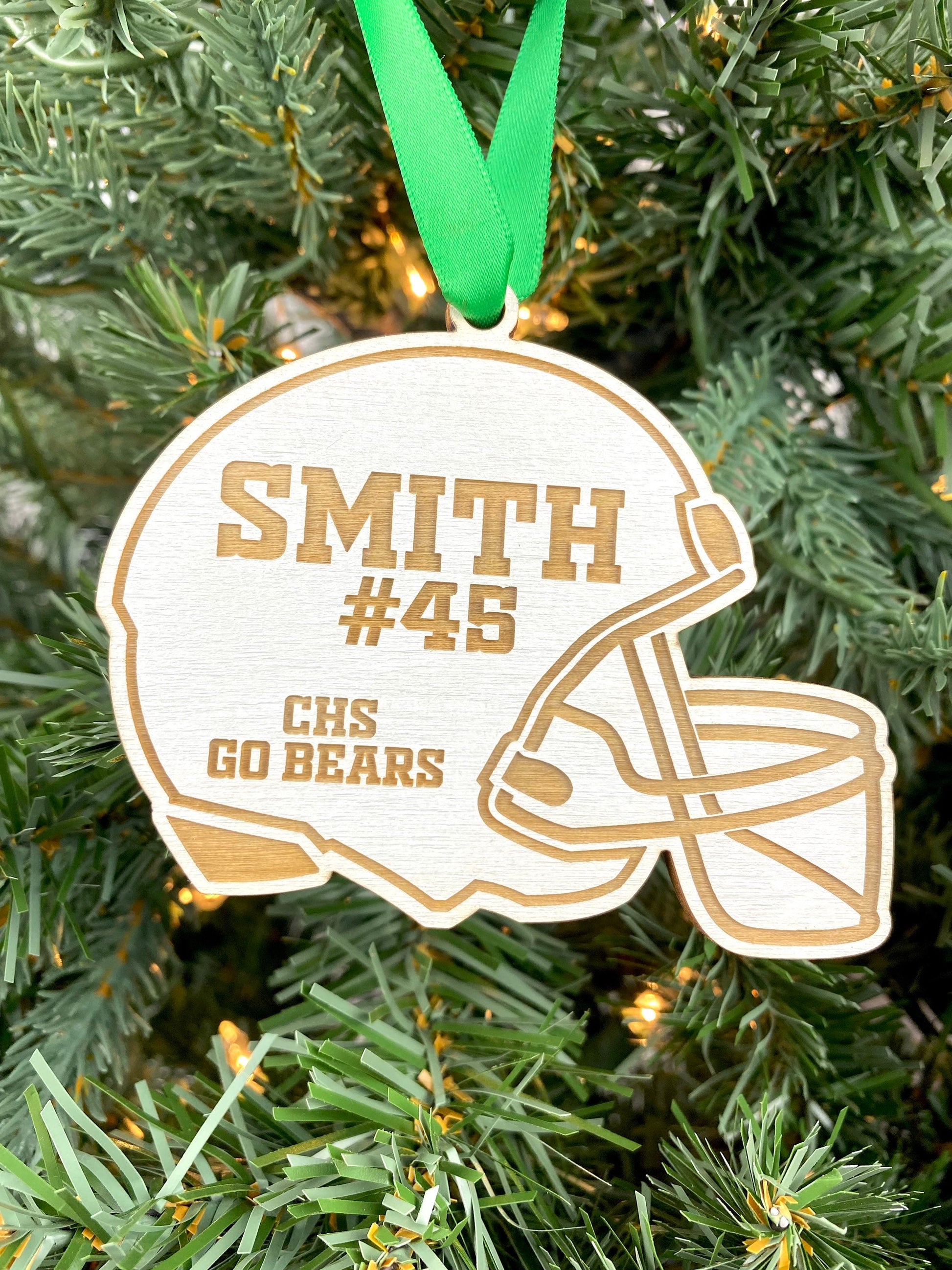 All ornaments are engraved and cut by a laser. Wood ornaments are made out of 3mm birch plywood and the clear ornaments are cut from 3mm acrylic. Choose team colors for the ribbon, or a holiday ribbon color of your choice. Each ornament is packaged in a clear plastic envelope, perfect for gift giving!